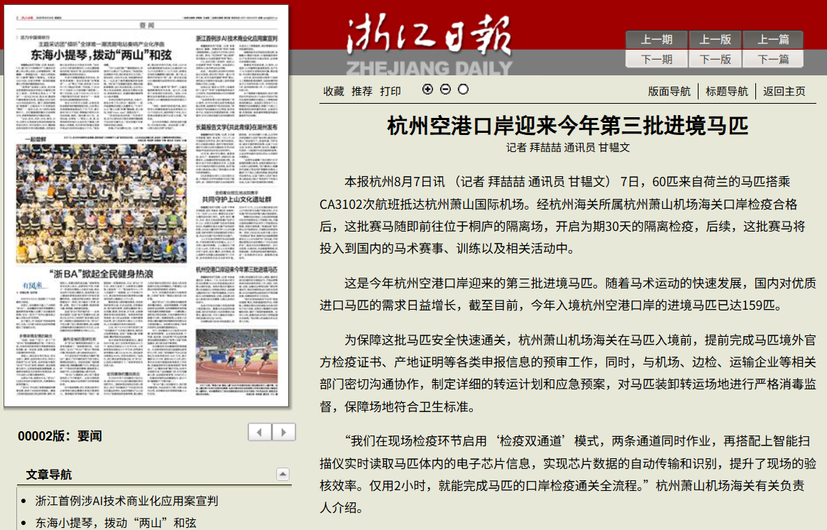 8月7日,浙江日報報道《杭州空港口岸迎來今年第三批進(jìn)境馬匹》。