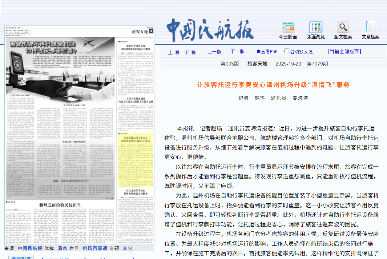 10月20日,中國民航報發(fā)布《讓旅客托運行李更安心溫州機場升級“溫情飛”服務(wù)》