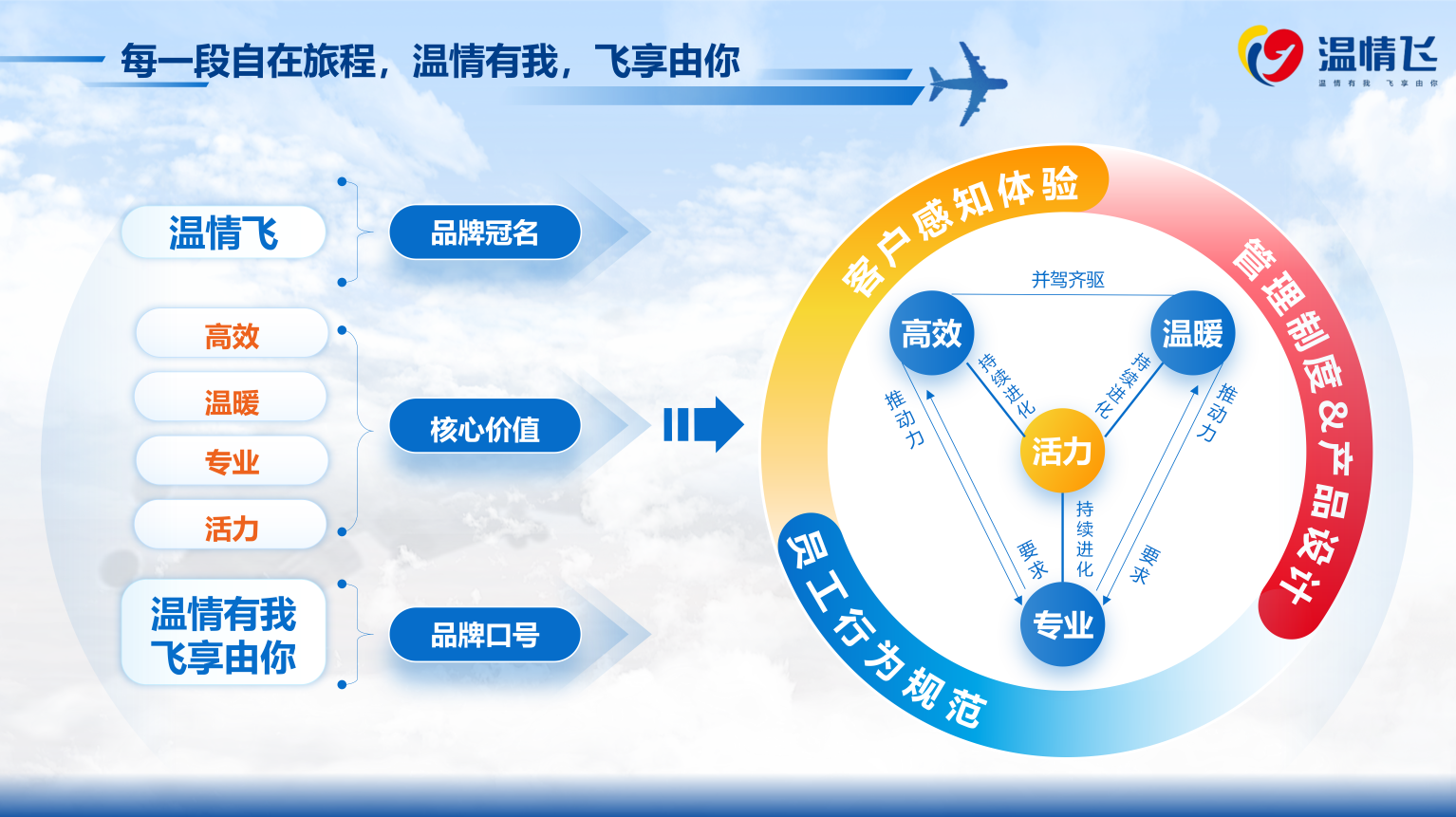 品牌Logo融合英文“Fly”衍生圖形與航空元素,凝練為包容呵護的心型結構,傳遞“溫情有我,用心相伴”的服務初心,詮釋“飛享由你,自在旅程”的品牌愿景。