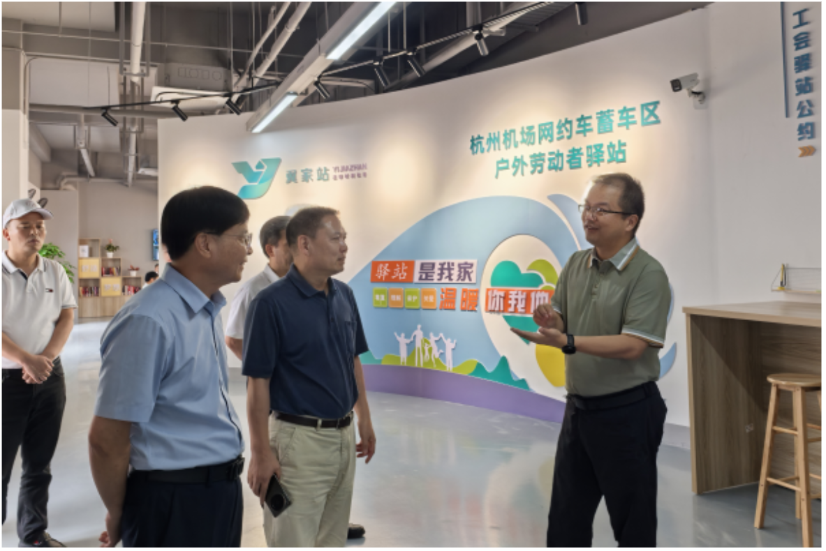 7月22日,杭州機場出租車、網(wǎng)約車蓄車區(qū)戶外勞動者驛站啟用,這是機場第二、第三處戶外勞動者驛站。啟用當天,集團工會主席鄭智銀陪同省總工會副主席施科,省總工會常委、省部屬企事業(yè)工會主席葉龍茂一行到驛站調(diào)研并開展高溫慰問。