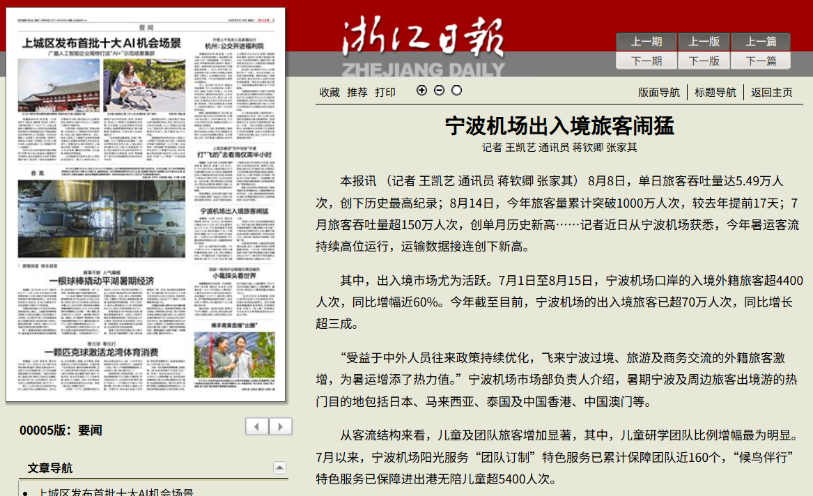 7月31日,浙江日報報道《寧波機(jī)場出入境旅客鬧猛》。