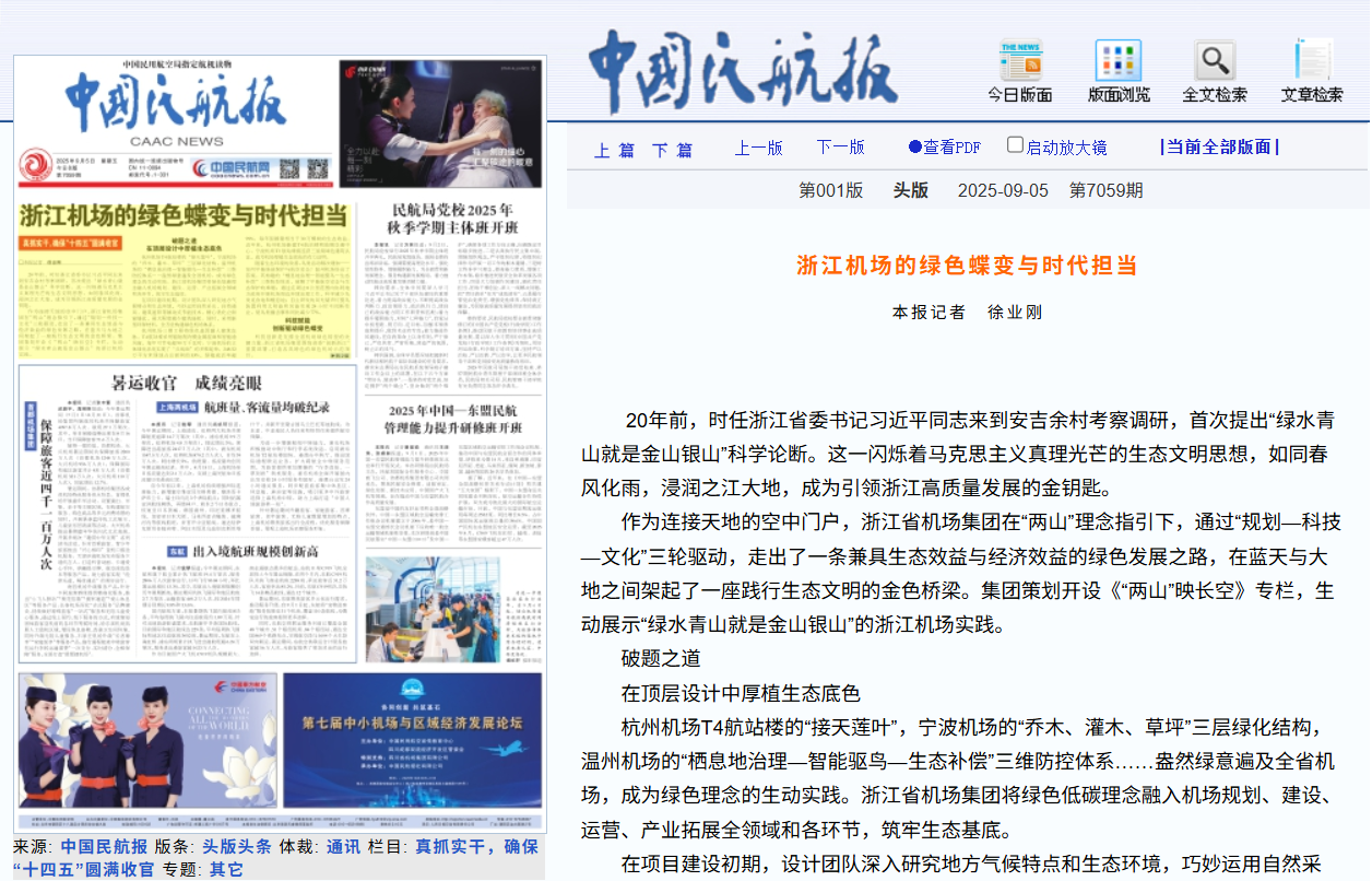 9月5日,中國(guó)民航報(bào)報(bào)道《浙江機(jī)場(chǎng)的綠色蝶變與時(shí)代擔(dān)當(dāng)》。